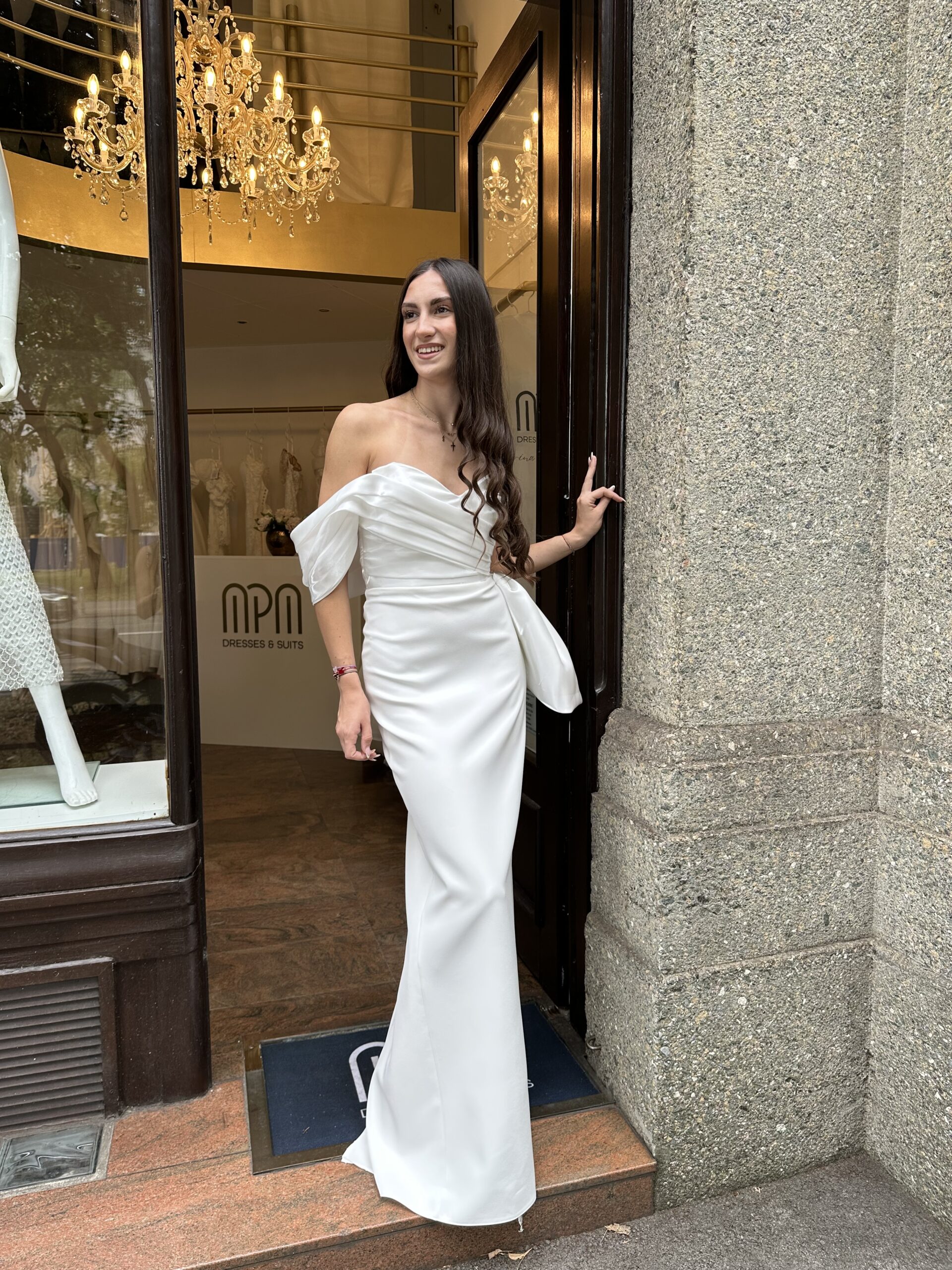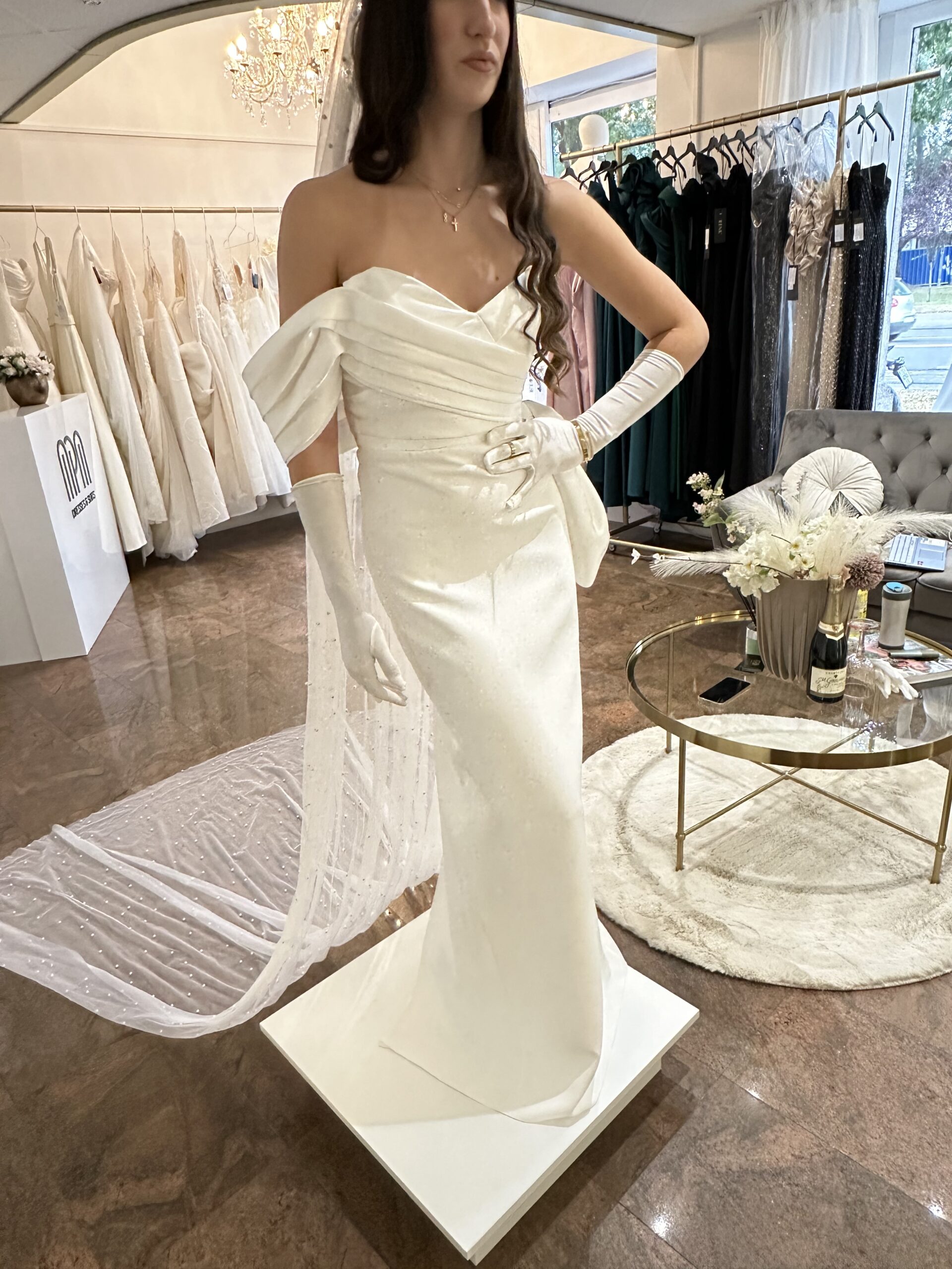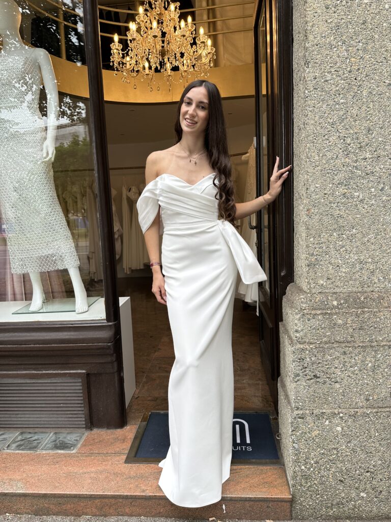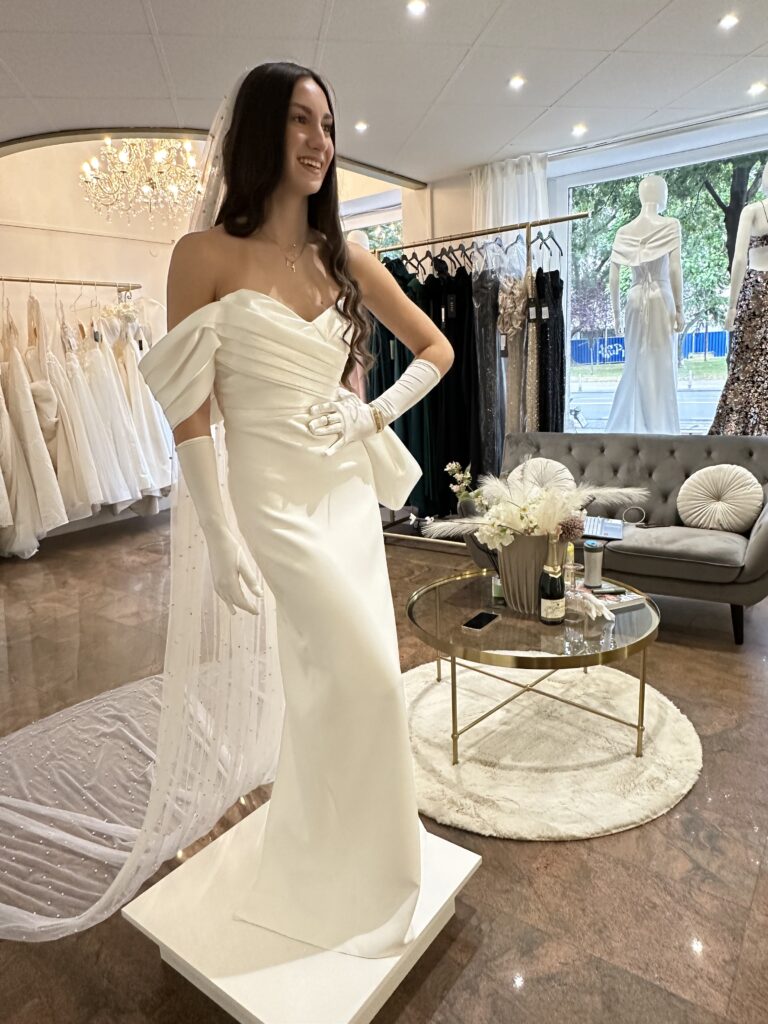 Ava je vjenčanica koja osvaja svojom profinjenom jednostavnošću i modernim krojem. Gornji dio od laganog orgadija čini njenu asimetriju i obavija rame, stvarajući romantičan i ženstven dojam dok donji dio od satena naglasava eleganciju i luksuz svakog koraka. Ova kreacija spaja mekoću i sjaj , lakoću i struktiru-stvorena za mladenku koja zna sto želi: sofisticiran izgled s dozom suptilnog glamura.