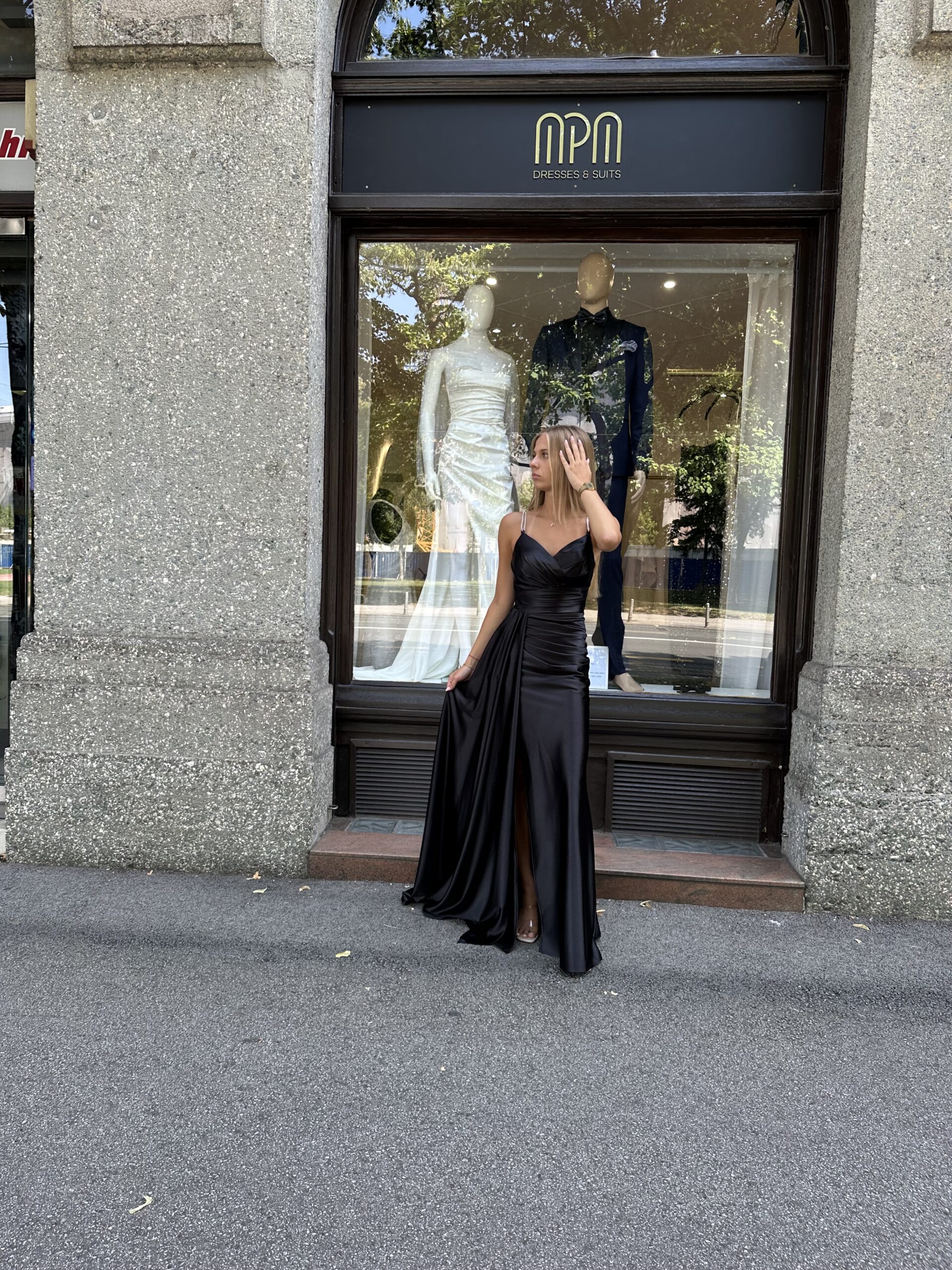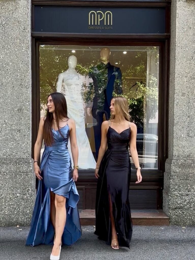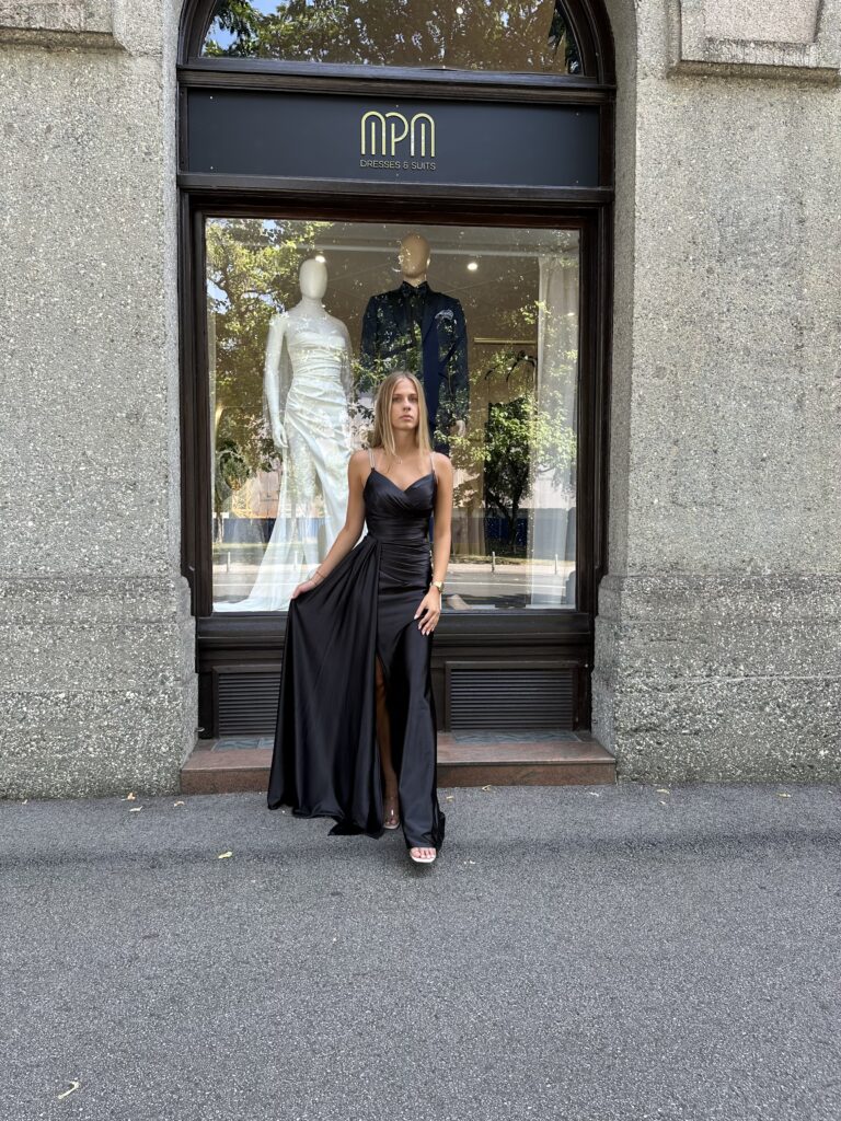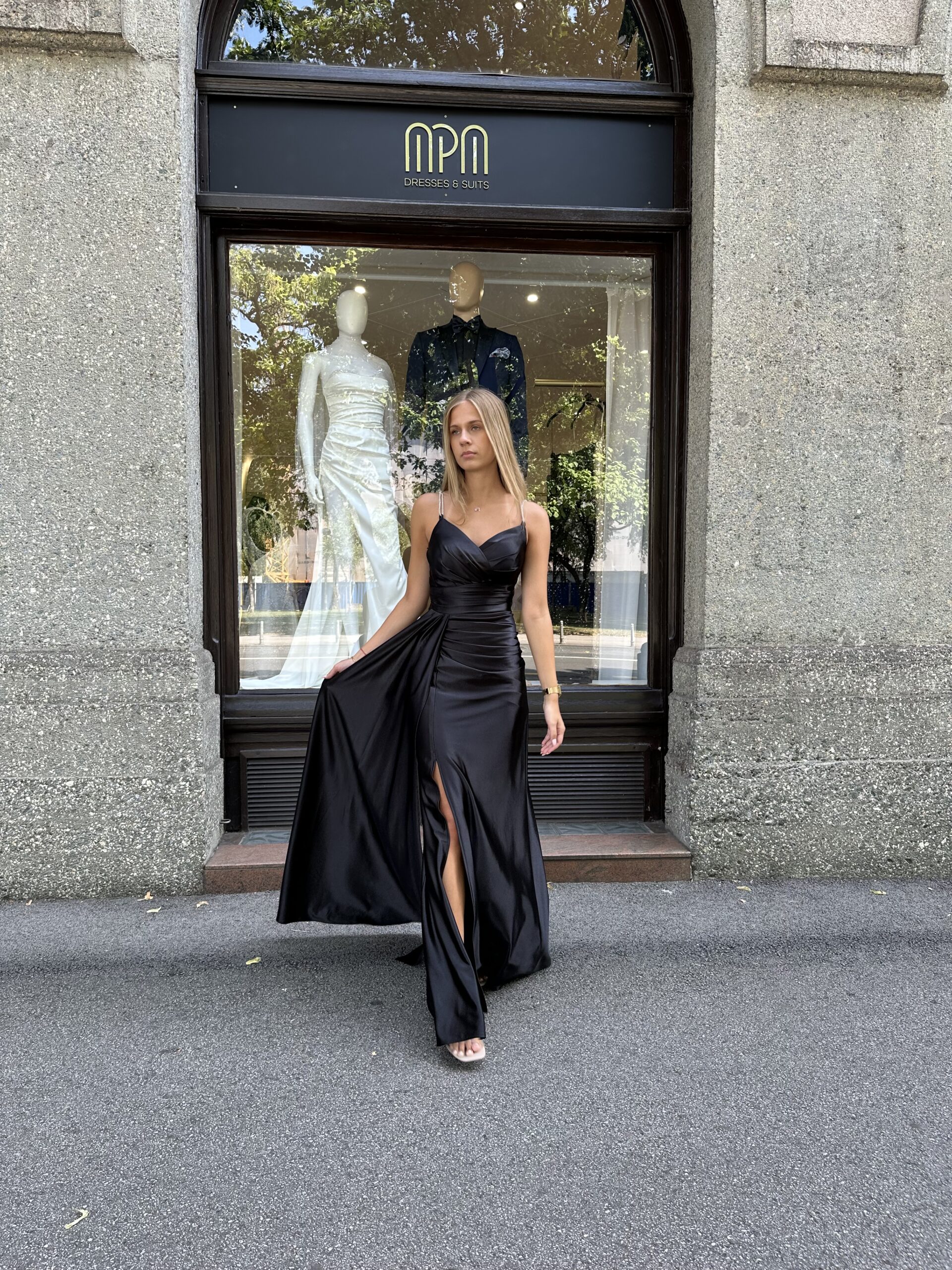 Duga večernja haljina elegantnog kroja s dubokim prorezom sprijeda i lagano naboranim detaljima na bokovima. Gornji dio ima V-izrez i tanke naramenice, naglašavajući dekolte i ramena. Model je izrađen od sjajnog, blago rastezljivog materijala koji prati liniju tijela i stvara sofisticiran dojam. Dostupna u više boja – na slici prikazane u metalik plavoj i klasičnoj crnoj varijanti. Idealna za maturalne večeri, svečane prigode i gala događanja.