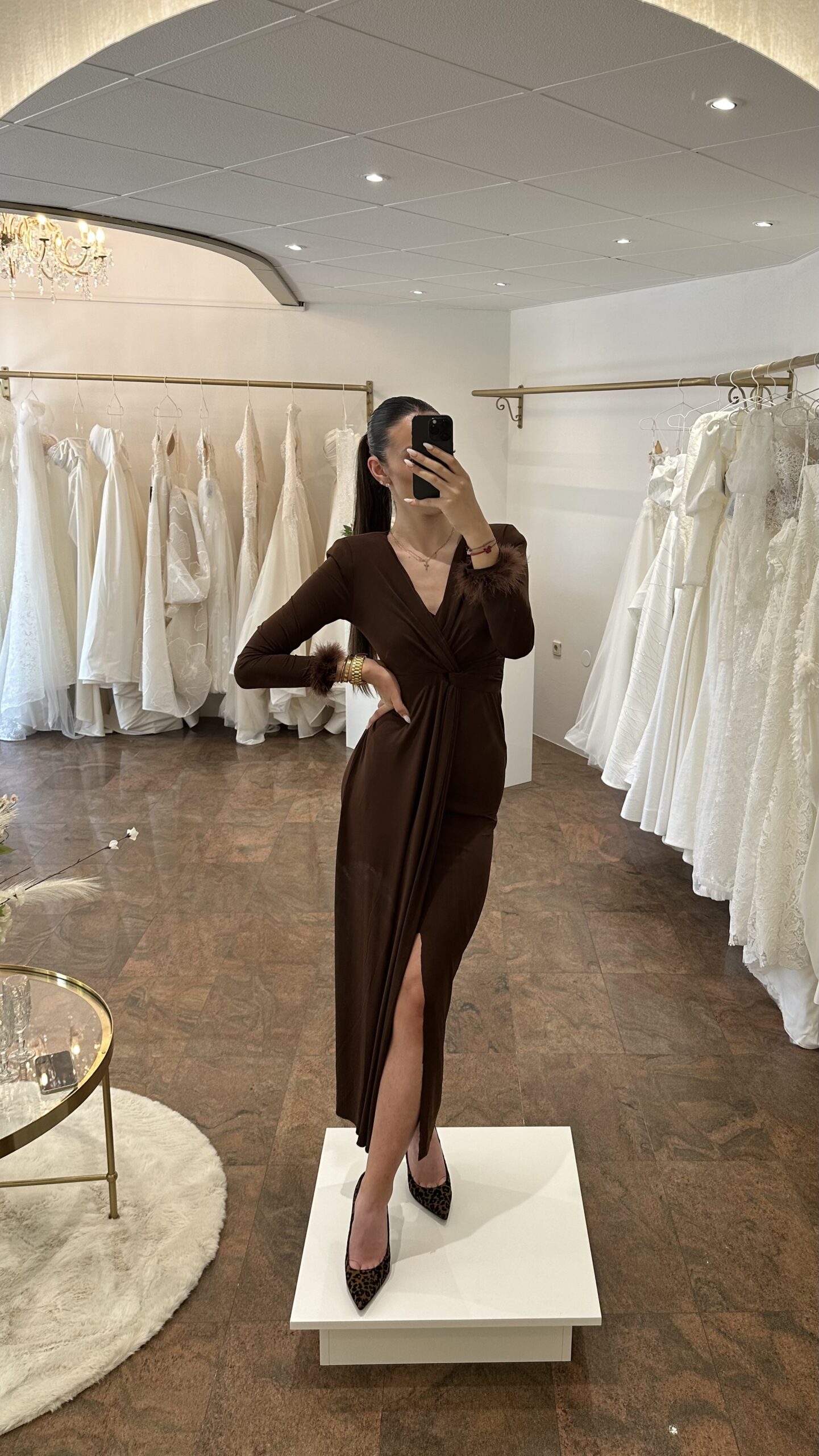 Haljina Bethany utjelovljenje je suptilne elegancije i sofisticiranog stila. Upečatljive čokoladno smeđe boje, s dugim rukavima i ženstvenim V-izrezom, ova haljina naglašava figuru na profinjen način.