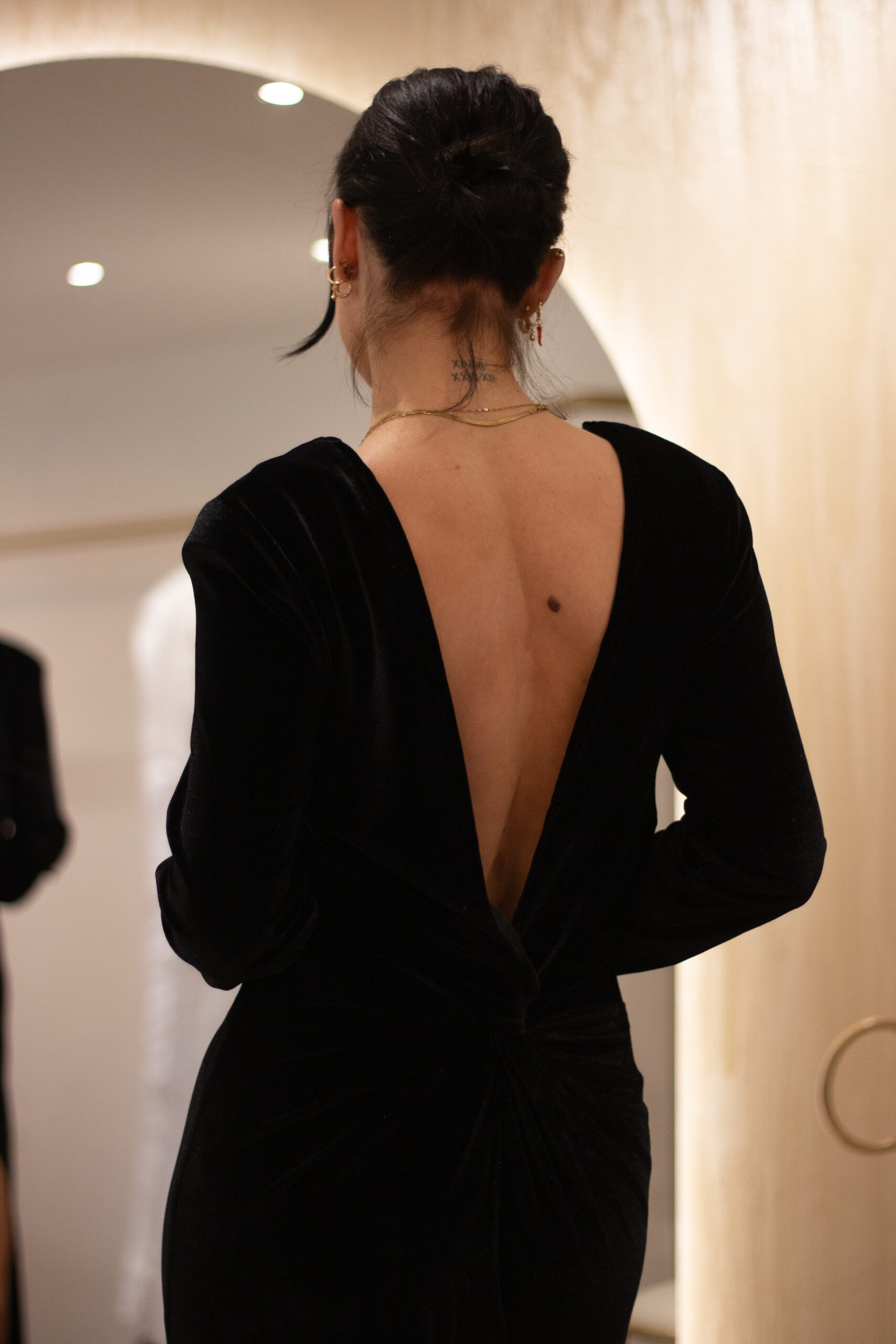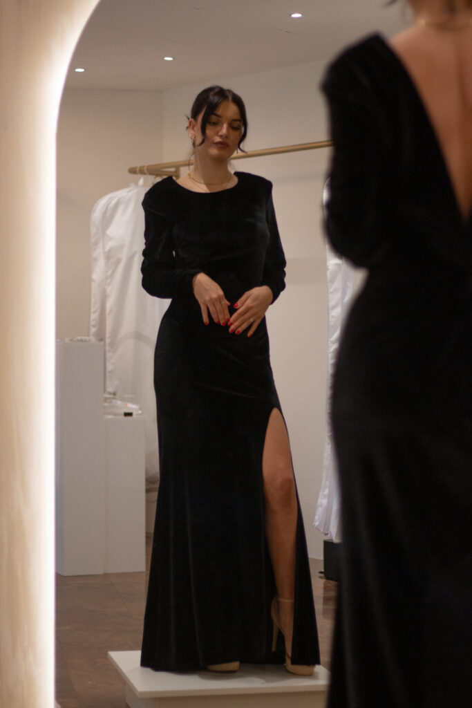 Uski kroj savršeno prati liniju tijela, dok naglašena ramena i dugi rukavi stvaraju snažan i profinjen okvir. Najveće iznenađenje skriva se straga – duboko otvorena leđa senzualno otkrivaju kožu, dok visoki prorez otvara pogled na nogu i unosi dozu zavodljivosti u svaki korak.