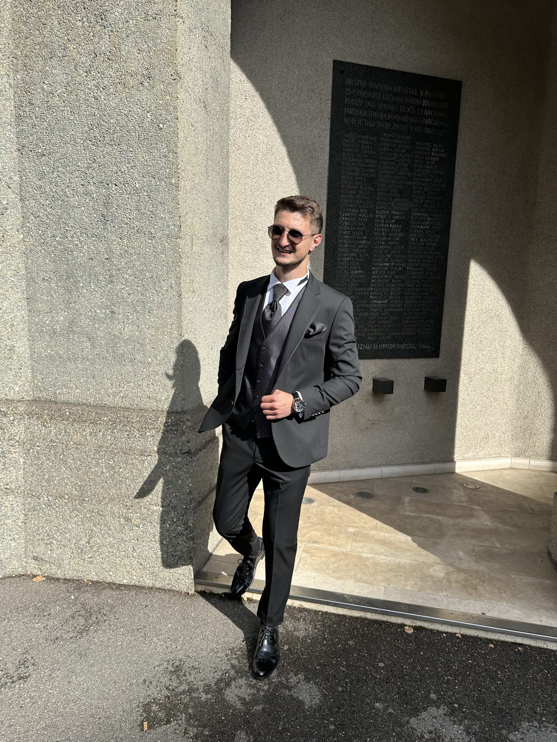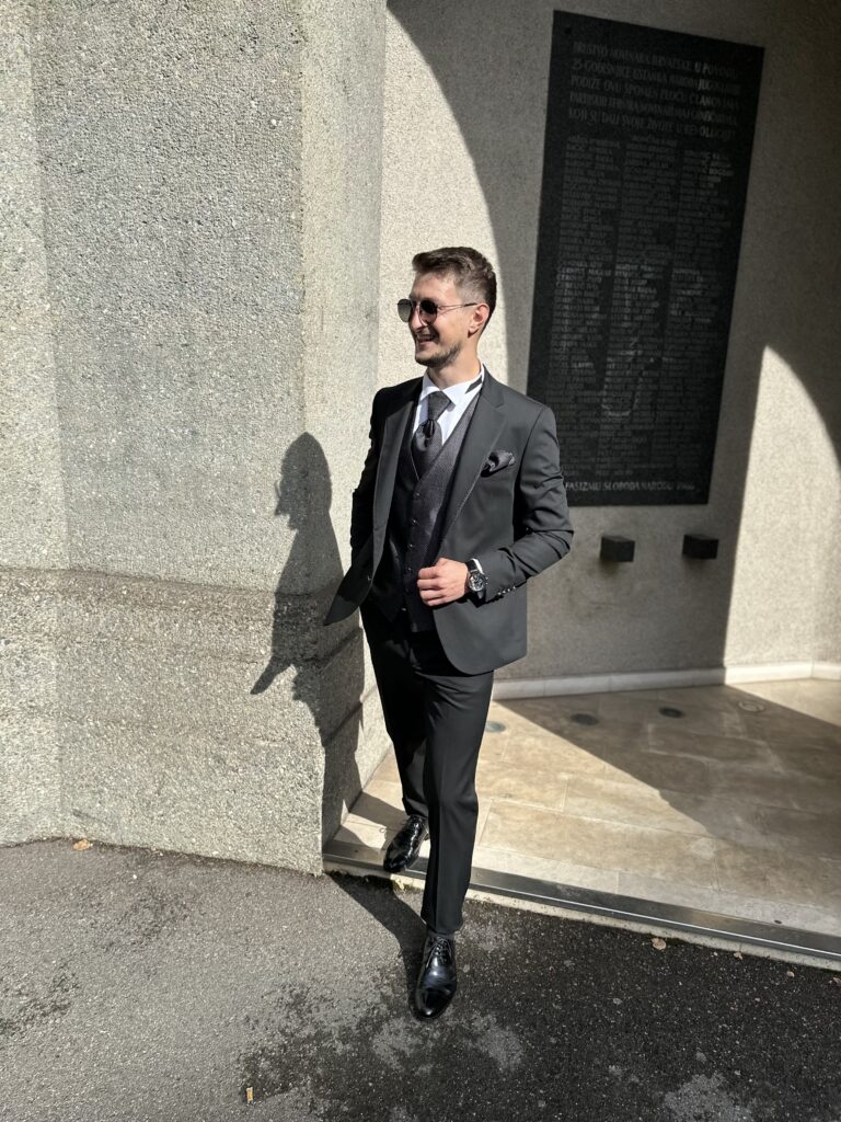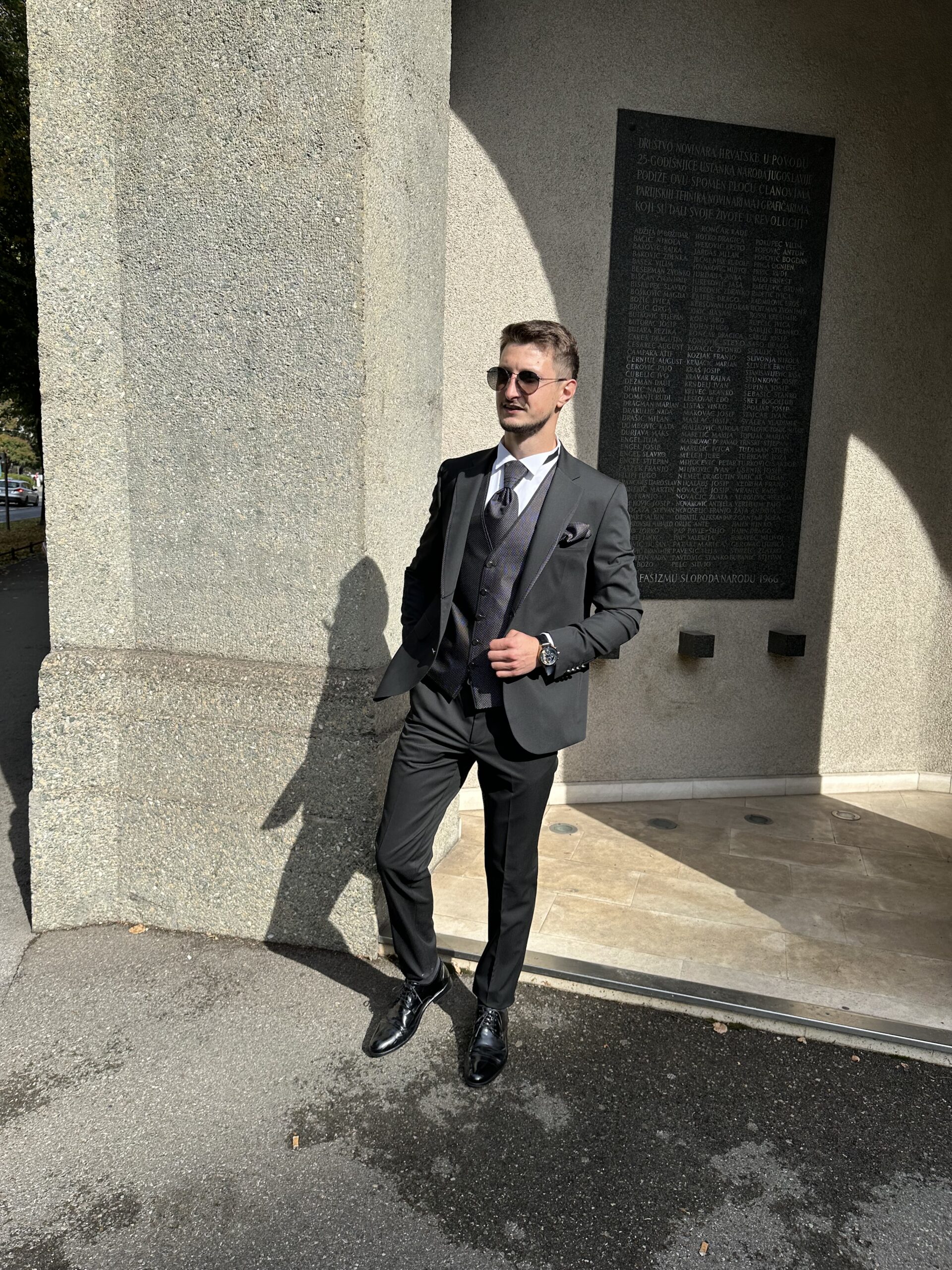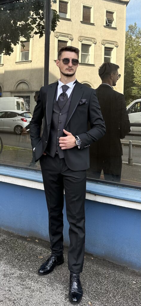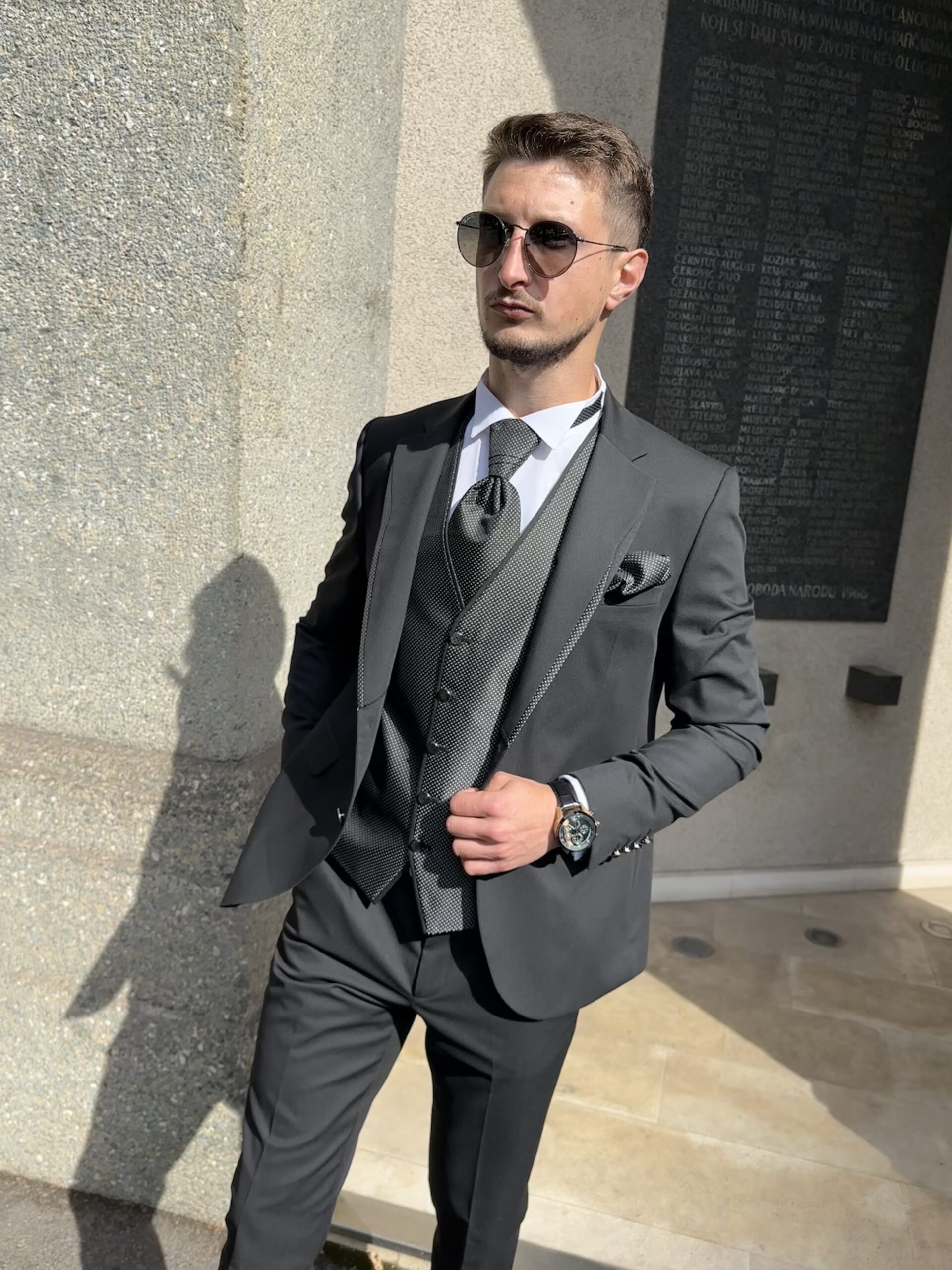Ovo moderno crno odijelo s prslukom dizajnirano je za muškarca koji želi izgledati besprijekorno – bilo da je riječ o vjenčanju, svečanoj večeri ili posebnom trenutku koji traži dozu luksuza.