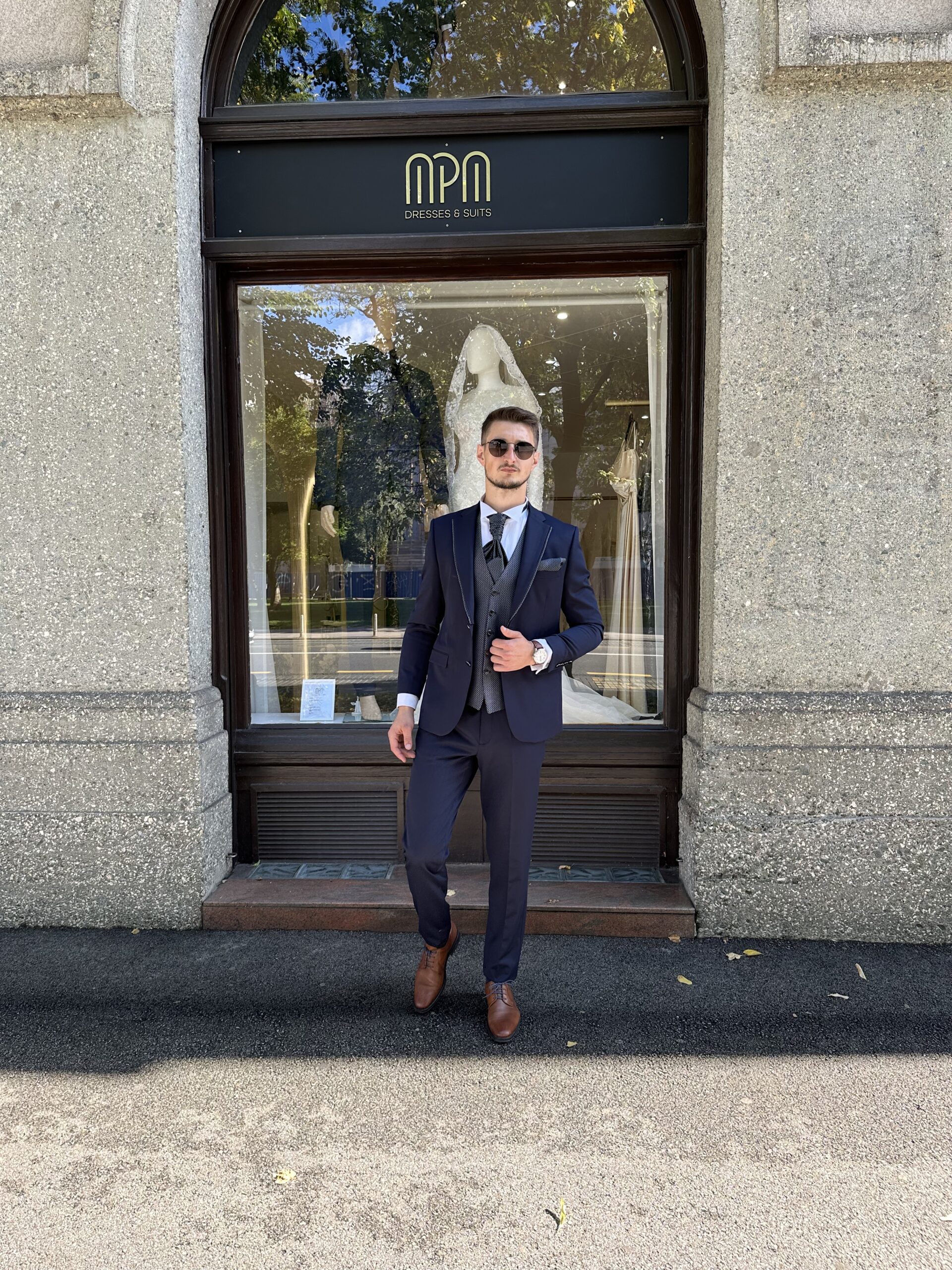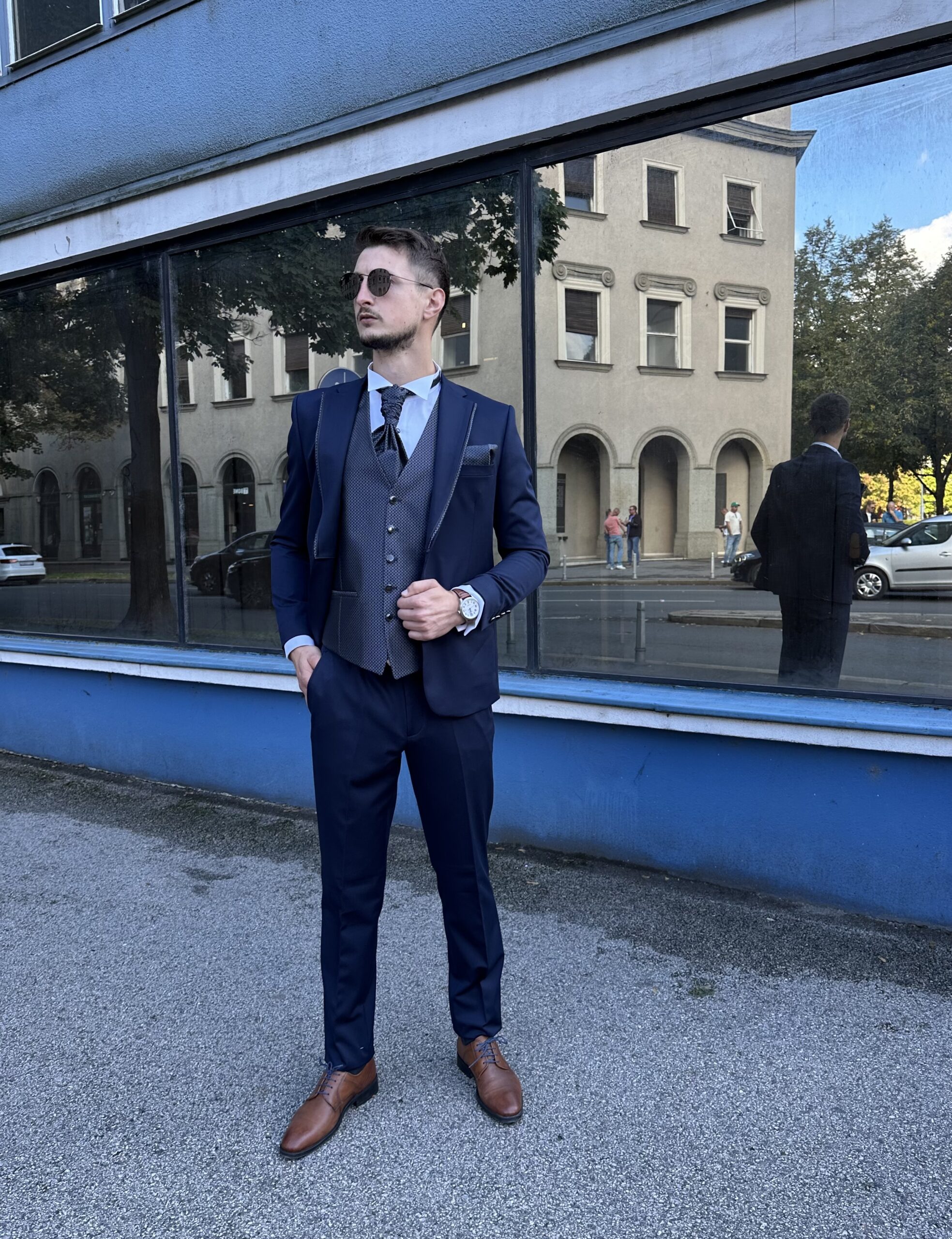 Tamnoplavo svečano odijelo s prslukom sjajnog tona