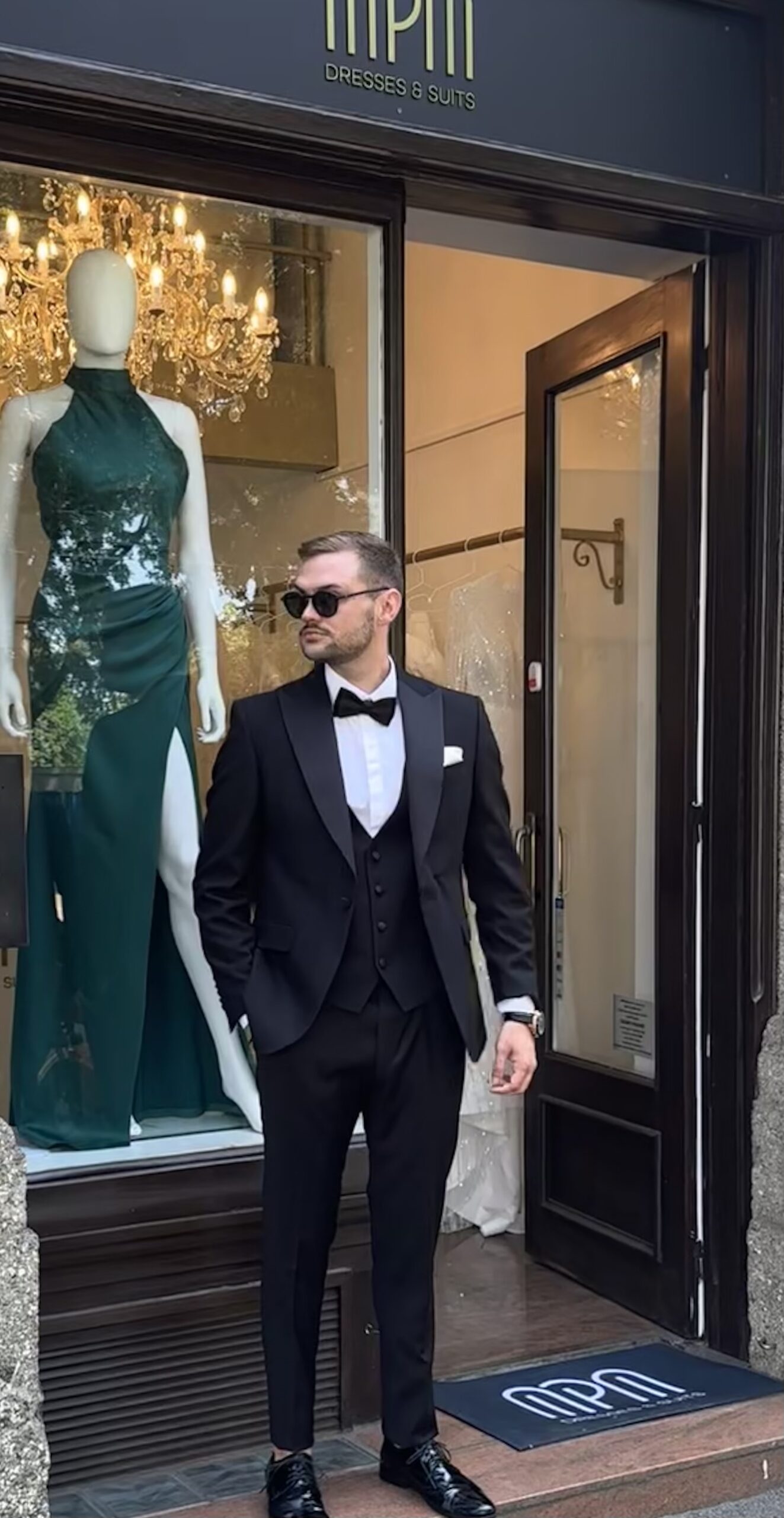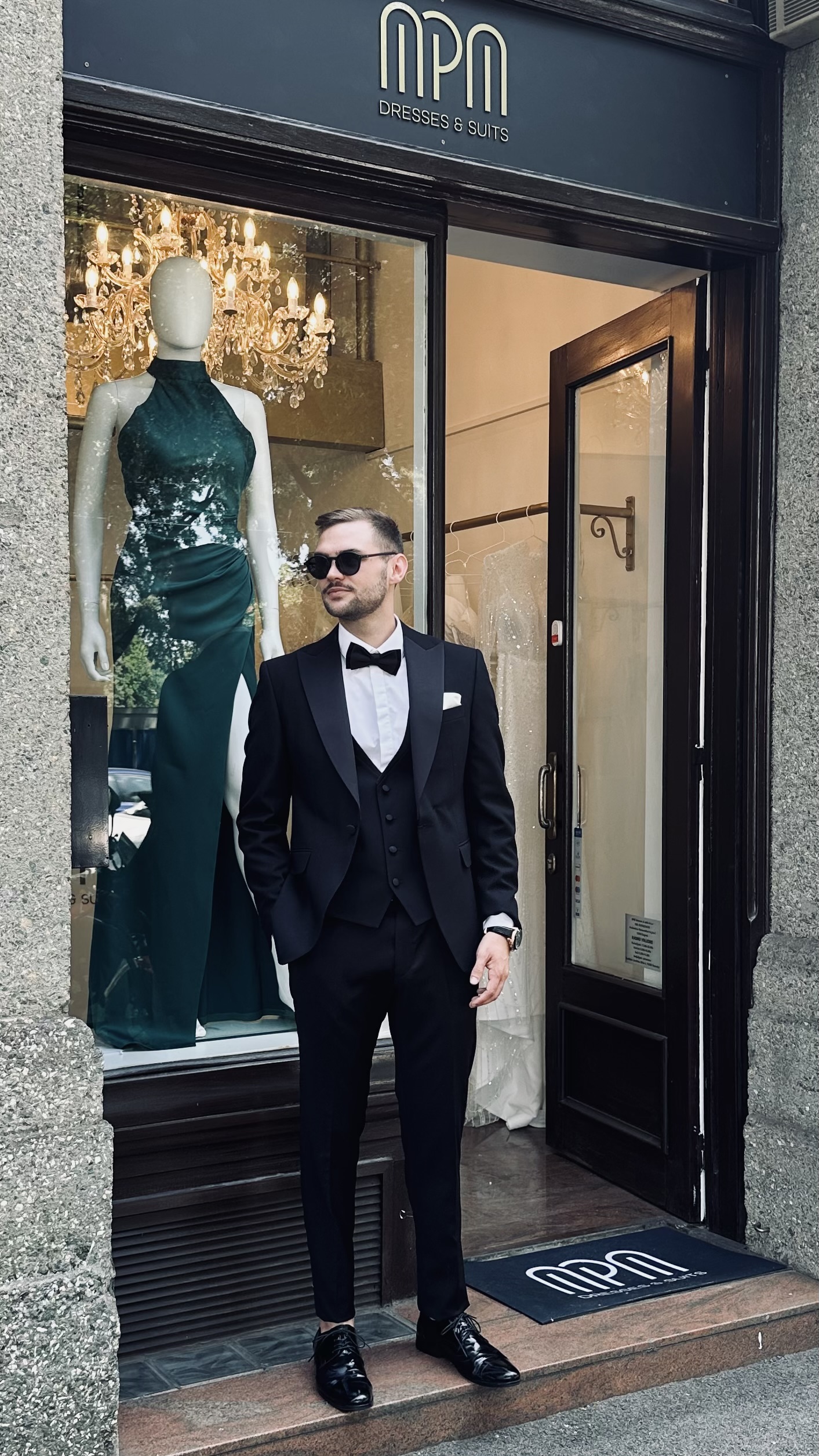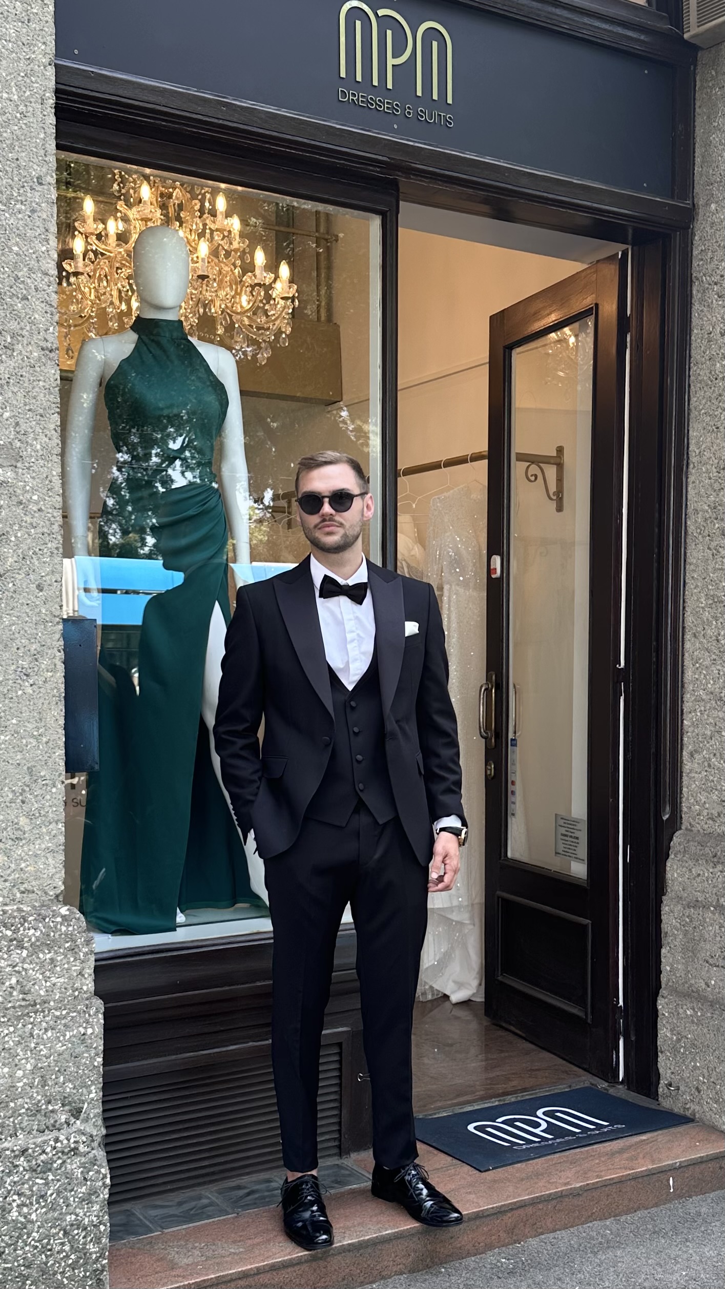 Crna boja i satenski rever daju odijelu svečani, gotovo gala karakter, čineći ga idealnim za vjenčanja, maturalne večeri i black tie događaje.