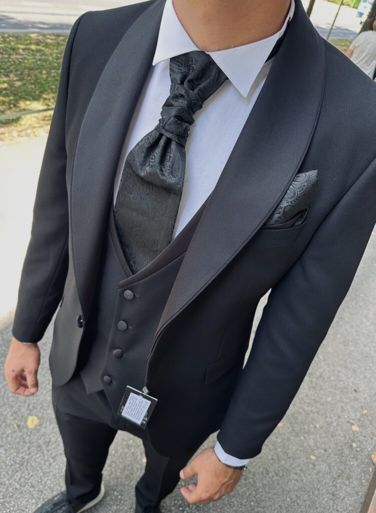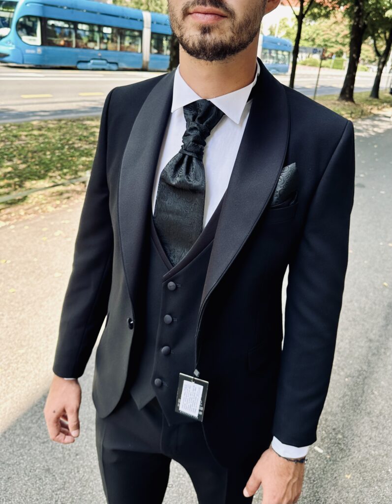 Elegantno i profinjeno, ovo svečano muško odijelo idealan je izbor za mladoženju koji želi izgledati besprijekorno na svom vjenčanju. Savršen kroj i luksuzni materijali pružaju osjećaj samopouzdanja i stila, dok prsluk, svečana kravata i ukrasna maramica dodaju dozu klasike i sofisticiranosti.