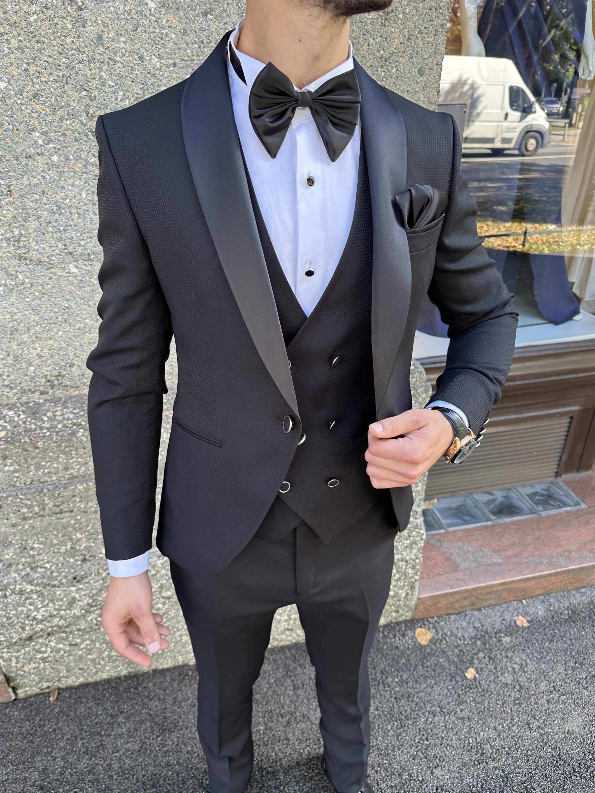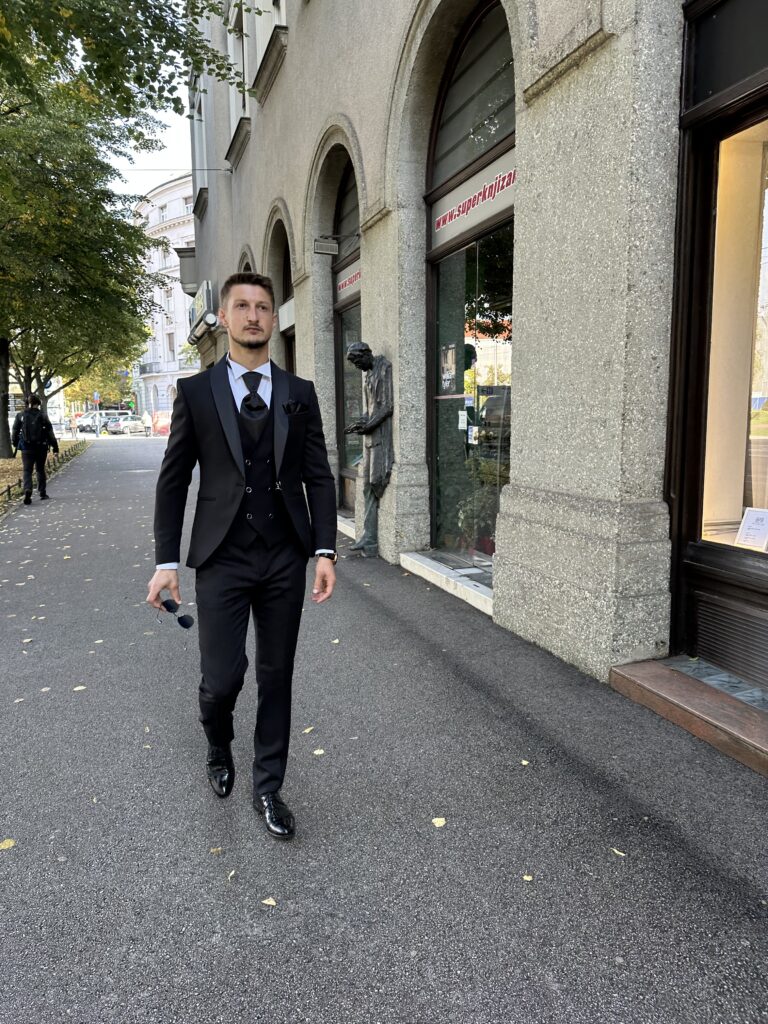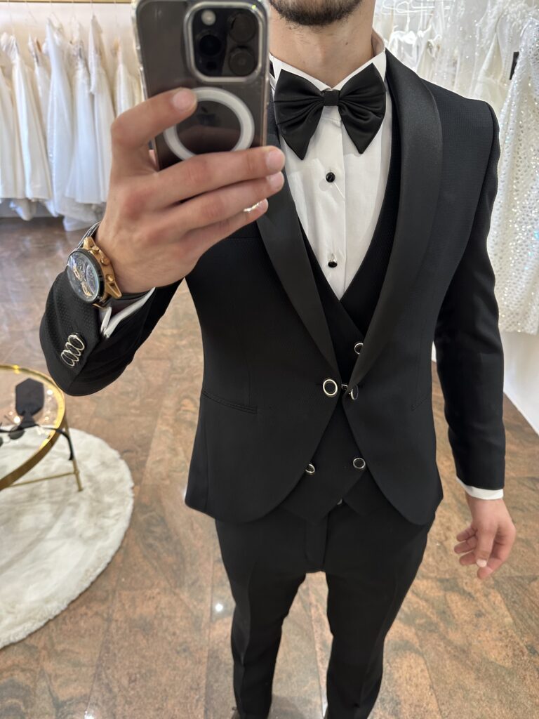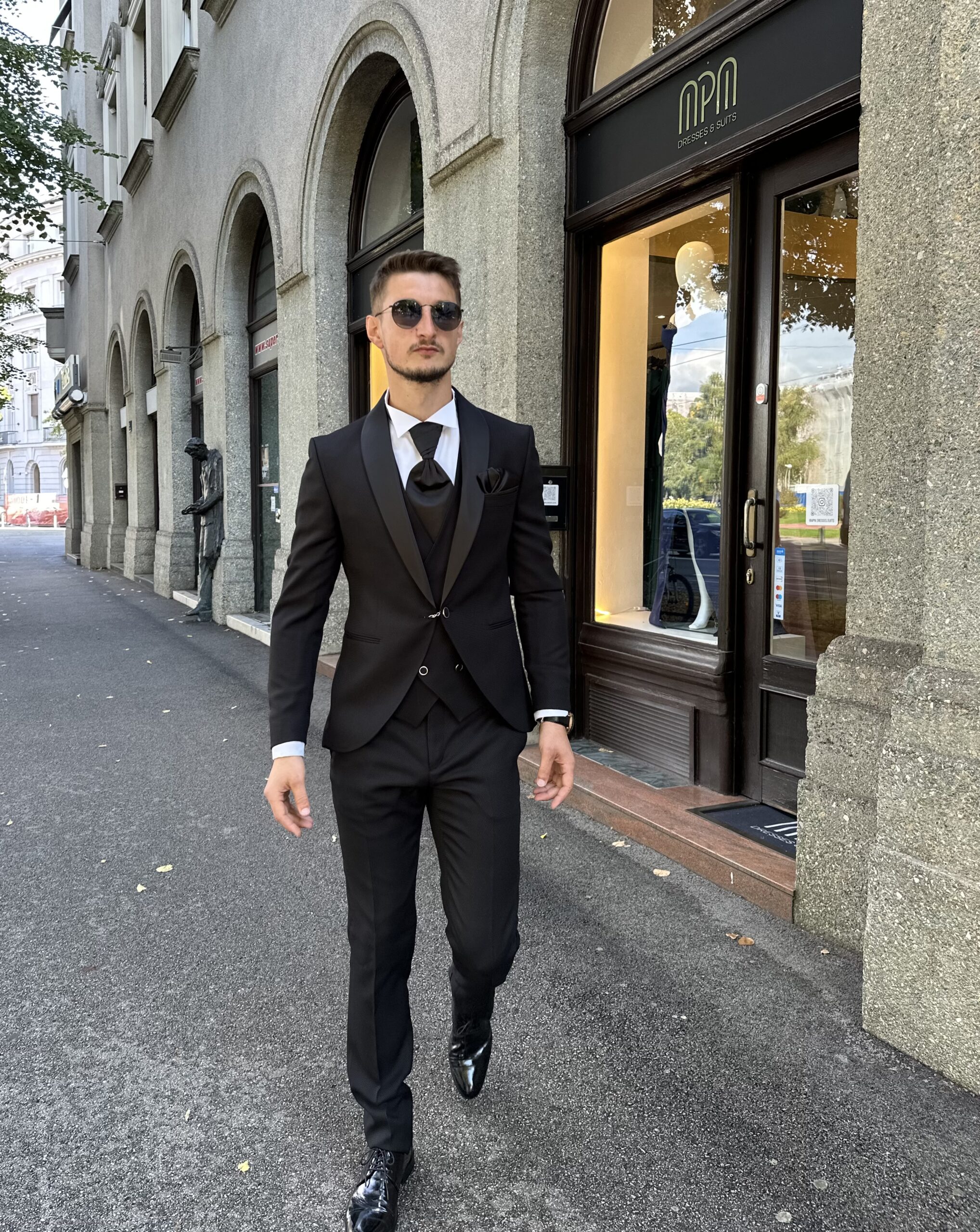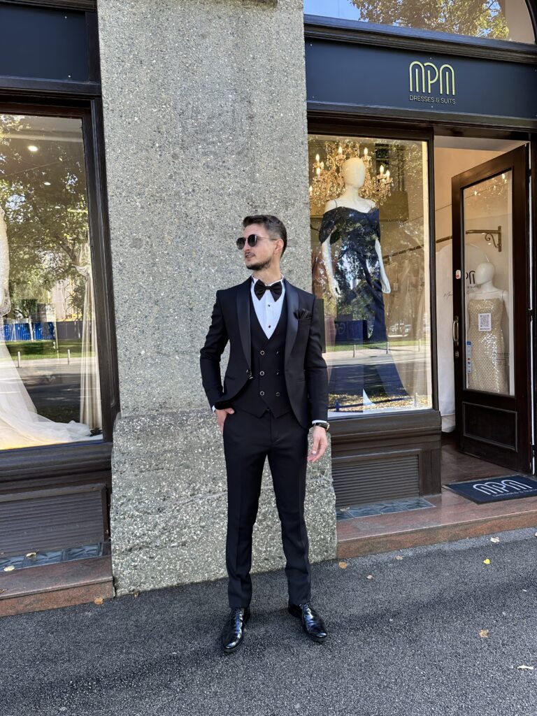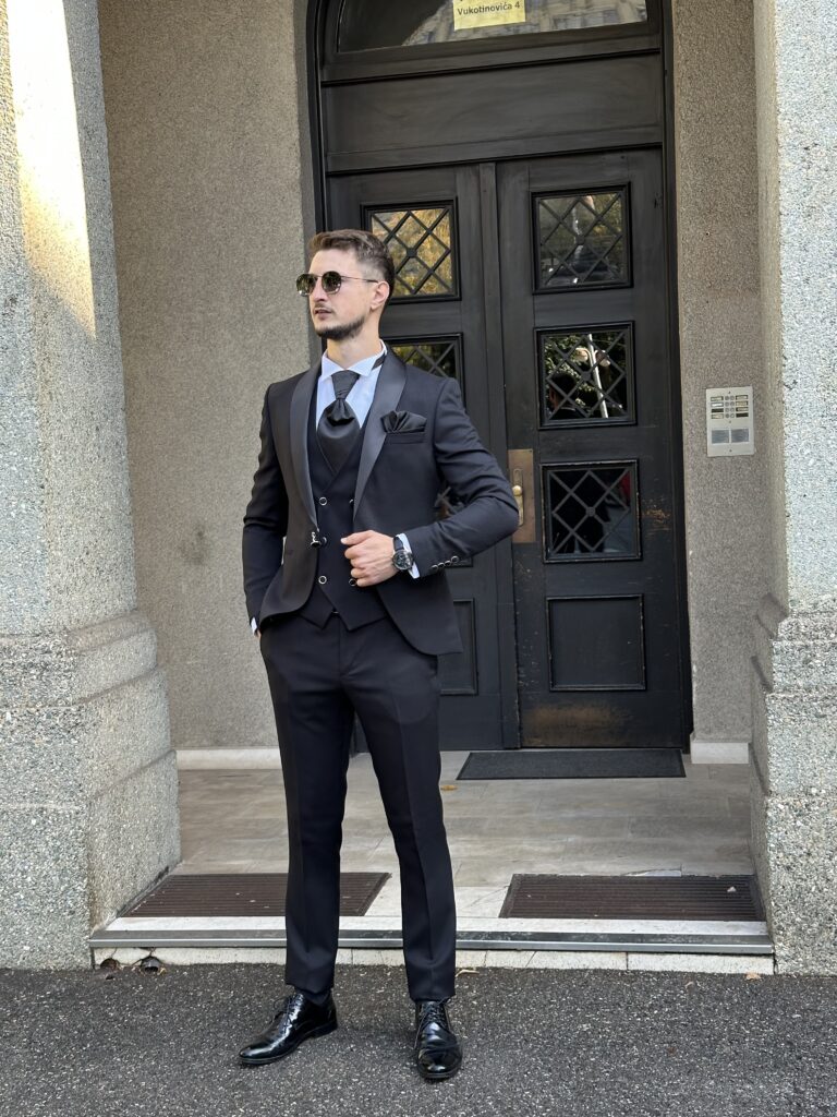 Sofisticirano crno muško odijelo izrađeno s naglaskom na savršeno krojenu siluetu i bezvremensku eleganciju. Kombinacija sakoa klasične linije i dvorednog prsluka pruža profinjen i moderan izgled koji odiše samopouzdanjem. Odijelo je izrađeno od visokokvalitetne tkanine s diskretnim sjajem na ovratniku i reljefne teksture što ga čini idealnim izborom za svečane prigode i večernje događaje.