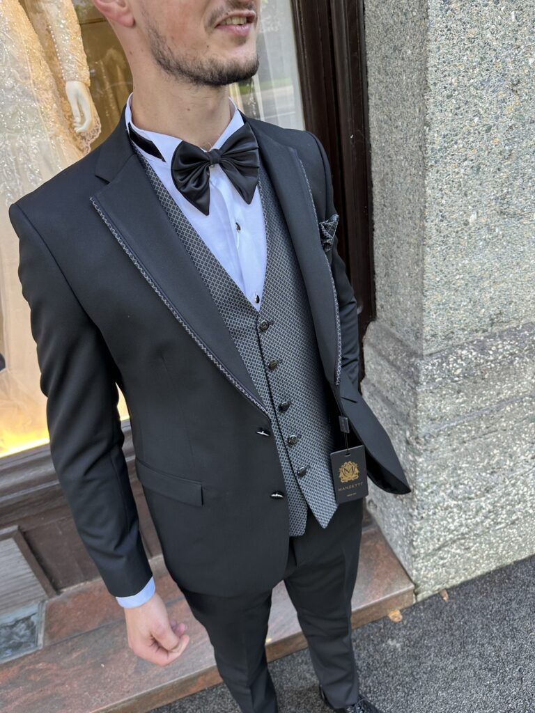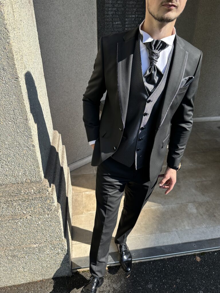 Ovo svečano crno odijelo utjelovljuje savršen spoj klasične elegancije i suvremenog luksuza. Precizno krojeno prema liniji tijela, izrađeno je od visokokvalitetne tkanine koja pruža uglađen izgled i nenadmašnu udobnost.