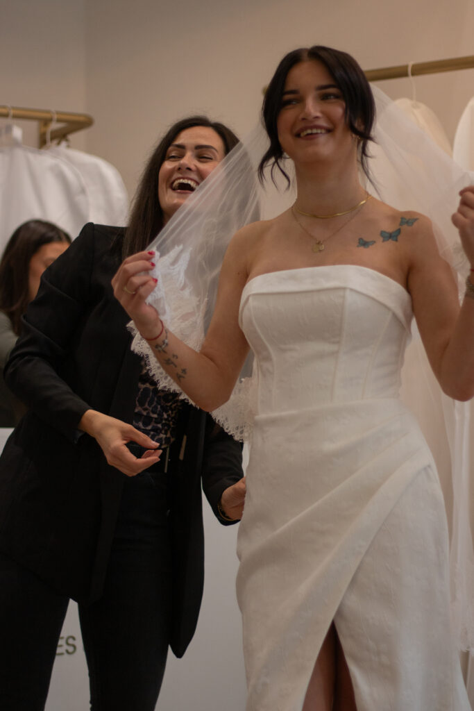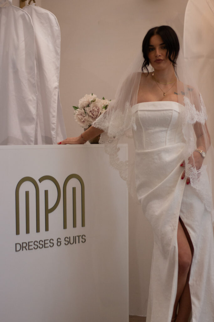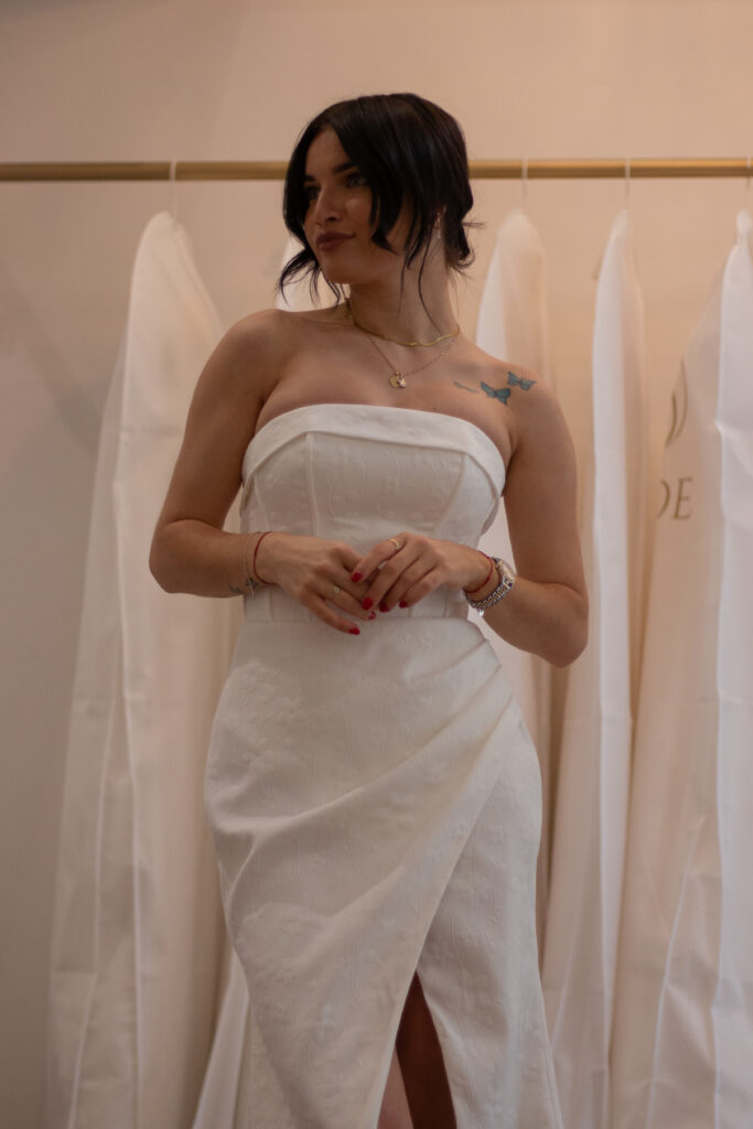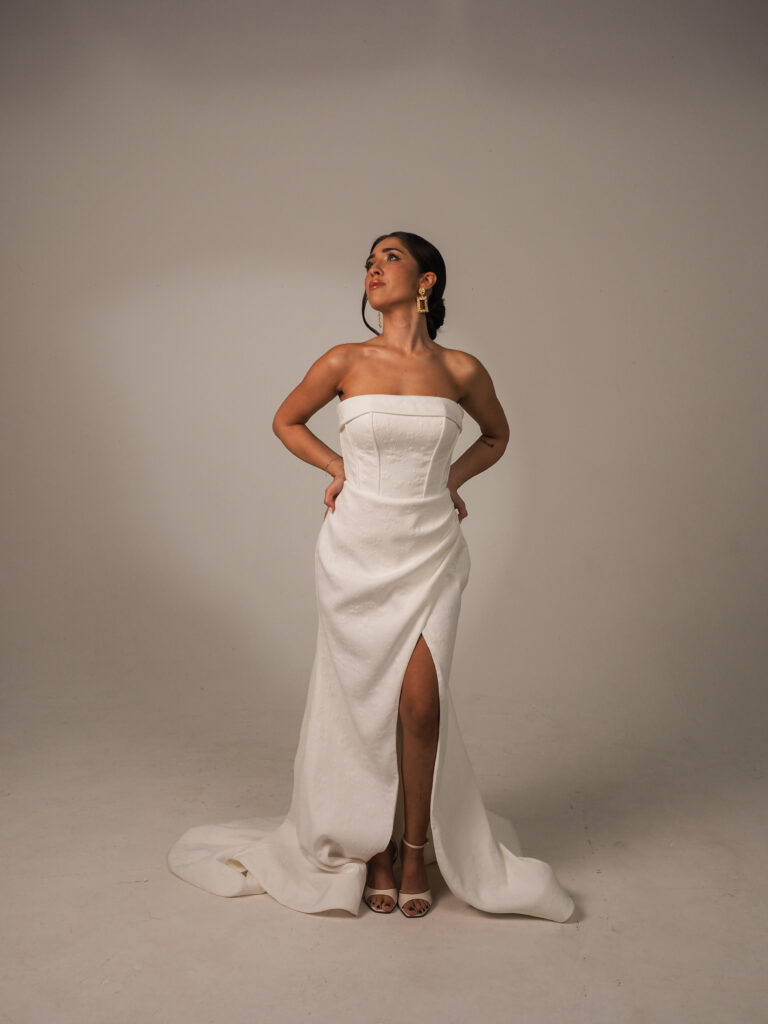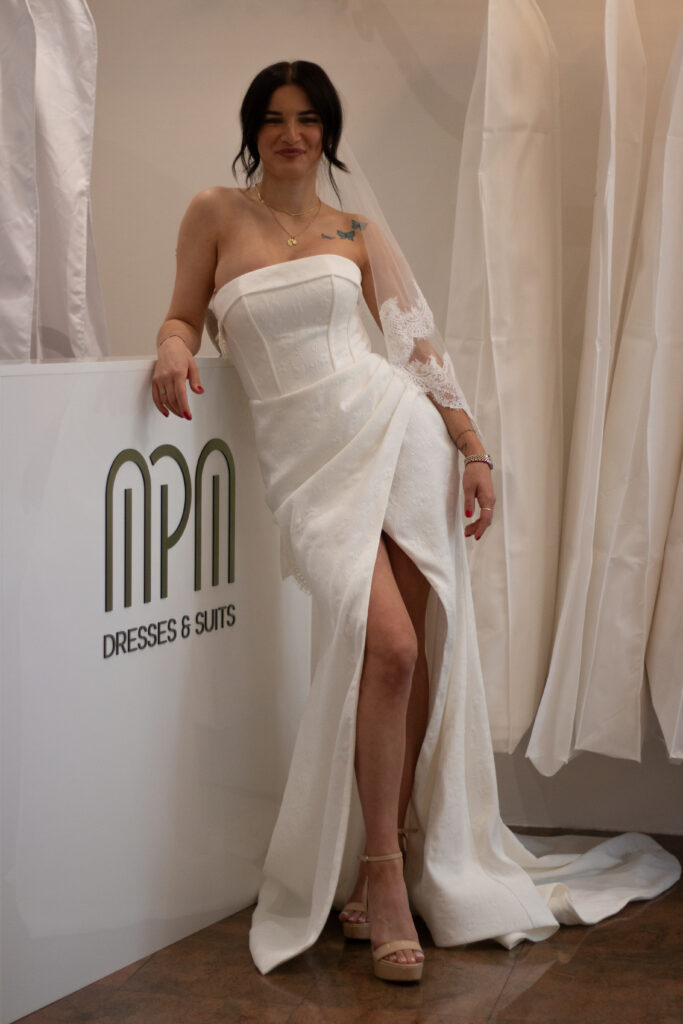 Elegantna A-kroj vjenčanica s laganim čipkastim detaljima i dubokim V-izrezom. Gornji dio je ručno vezen, dok lepršava suknja od tila stvara romantičan i prozračan dojam pri svakom koraku. Idealna za mladenke koje žele spoj klasične ljepote i suptilne moderne elegancije.